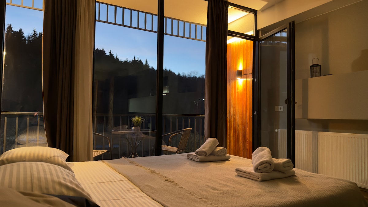 Enjoy skiing, nature walks and full comfort at Kokhta-Mitarbi resort. This ski in/ski out development is unique in Bakuriani. Flat has a balcony directly overlooking the forest and all the amenities to help you enjoy your vacation all year round. ისიამოვნეთ სრიალითა და ბუნებაში სეირნობით კოხტა-მიტარბის კურორტზე, რომელიც უნიკალურია თავისი მდებარეობითა და ინფრასტრუქტურით ბაკურიანში. თქვენ შეგიძლიათ მშვიდად დაისვენოთ ბინაში მთელი წლის განმავლობაში და დატკბეთ პიდაპირი ხედით კოხტას მთაზე.