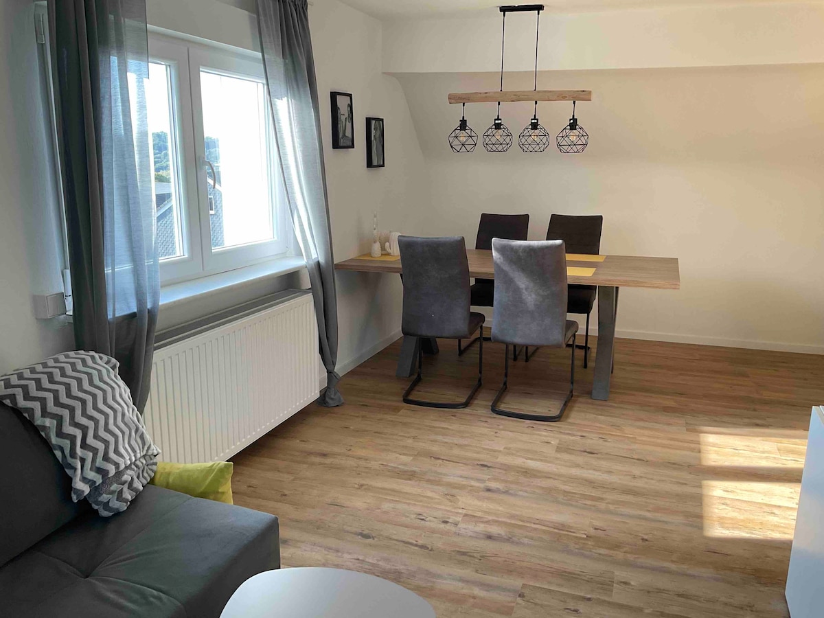 Современная квартира (70 кв. м) с 2 спальнями, полностью оборудованной кухней и уютной гостиной. Тихое расположение на окраине города, магазины и общественный транспорт в шаговой доступности. Бесплатная частная парковка прямо у дома. До старого города Хаттингена с фахверковыми домами, кафе и ресторанами можно дойти пешком. Идеально подходит для велосипедистов благодаря велосипедным дорожкам Рурталь. Идеально подходит для пар, семей и друзей – будь то короткая поездка или длительное пребывание. С нетерпением ждем вас! ✨