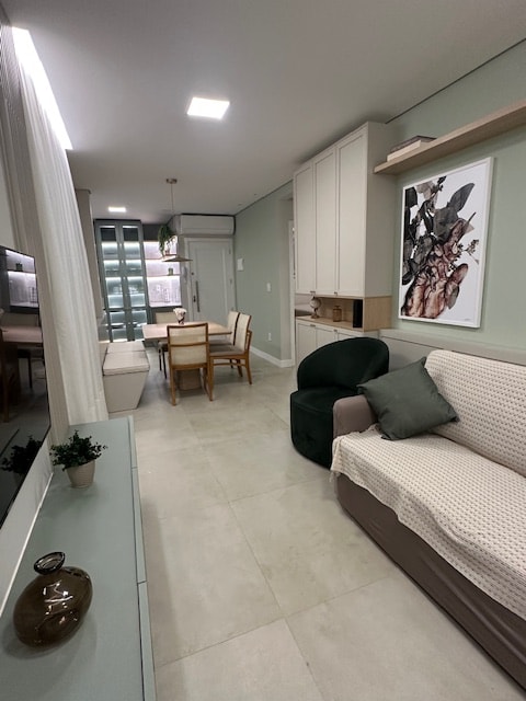 Aconchegante, praiano, отремонтированная и оформленная боковая квартира в Prédio Frente Mar! Идеально подходит для требовательных пар с интимной и гостеприимной атмосферой -> Lava e Seca -> Легко добраться до пляжа, Parque Interpraias, Bondinho, Marina, Aquarium, Pirate Adventure, Espaço FG Sul ! -> Горячие и холодные кондиционеры во всех помещениях! -> 1 парковочное место с услугами парковщика. -> Кухня со всем необходимым для приготовления простых блюд. -> Меблировано и оформлено очень тщательно, с акцентом на тепло и комфорт.