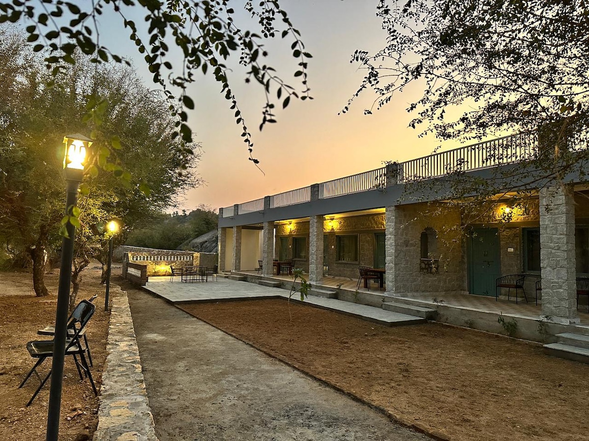 The Rustic Jawai Lodge & Safari, Get away from it all when you stay under the stars. this Farm situated close to Jawai leaopard Safari & Dam, located in mid of nature and hills, the farm house offered 8 Bed room, kitchen and a common swimming pool size 20x30 kids pool 7x5, among 8 rooms (04 Room Double bed, 04 Rooms Triple bed & 02 Suite with Four bed) Garden, the famr offered a proper care taker and service staff who can fulfiled major basic requirement of guest
