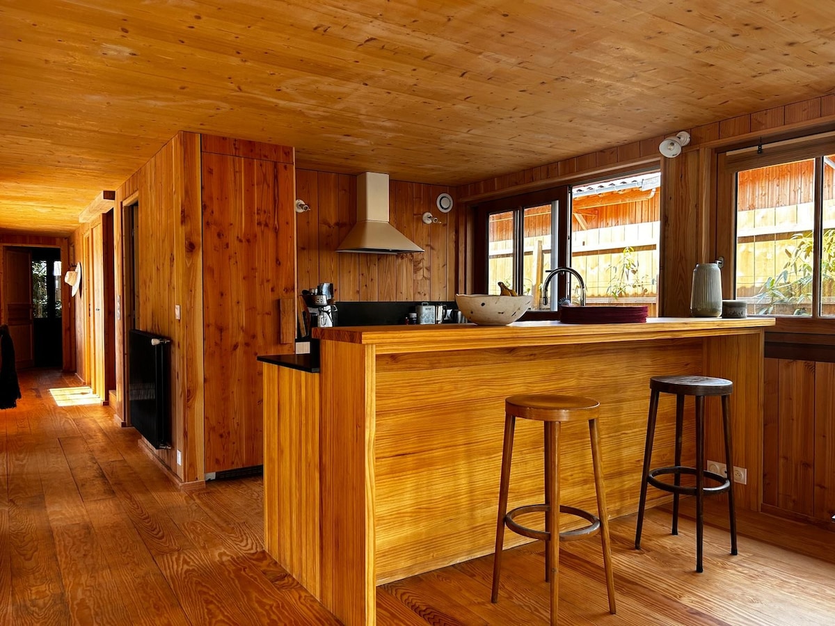 Из этого семейного жилья открывается потрясающий вид на бассейн Аркашон, его расположение в доминирующем положении дает вашему домику ощущение эксклюзивности и благополучия. Сосновый лес с одной стороны, раковина в ритме приливов с другой - идеальное место для подзарядки батареек как можно ближе к природе. Внимание ! Обратите внимание, что на кухне есть только микроволновая печь, мини-бар и кофемашина Nespresso. Есть посуда.
