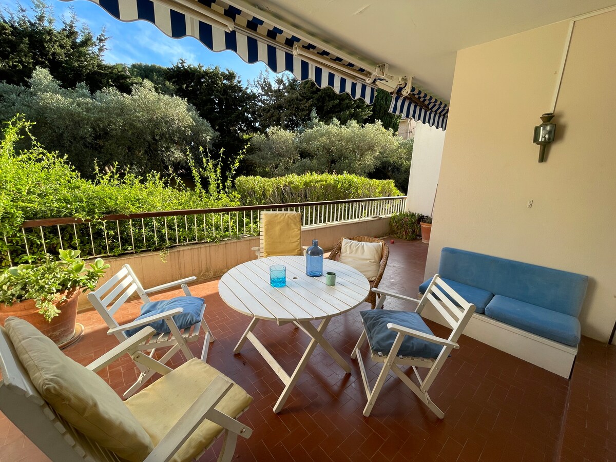 В тихой резиденции, в 300 метрах от Порт-де-ла-Мадраг, пляжа, ресторанов, магазинов, двухкомнатной квартиры с террасой, видом на юг, видом на сосновый лес и море. Частная парковка. Мы позаботились о декоре и оборудовании, чтобы ваше пребывание было максимально приятным. В распоряжении гостей - оптоволоконный и телевизор. Идеальная квартира для семьи из 4 человек (двое взрослых и двое детей), а также для пары. КУРЕНИЕ ЗАПРЕЩЕНО