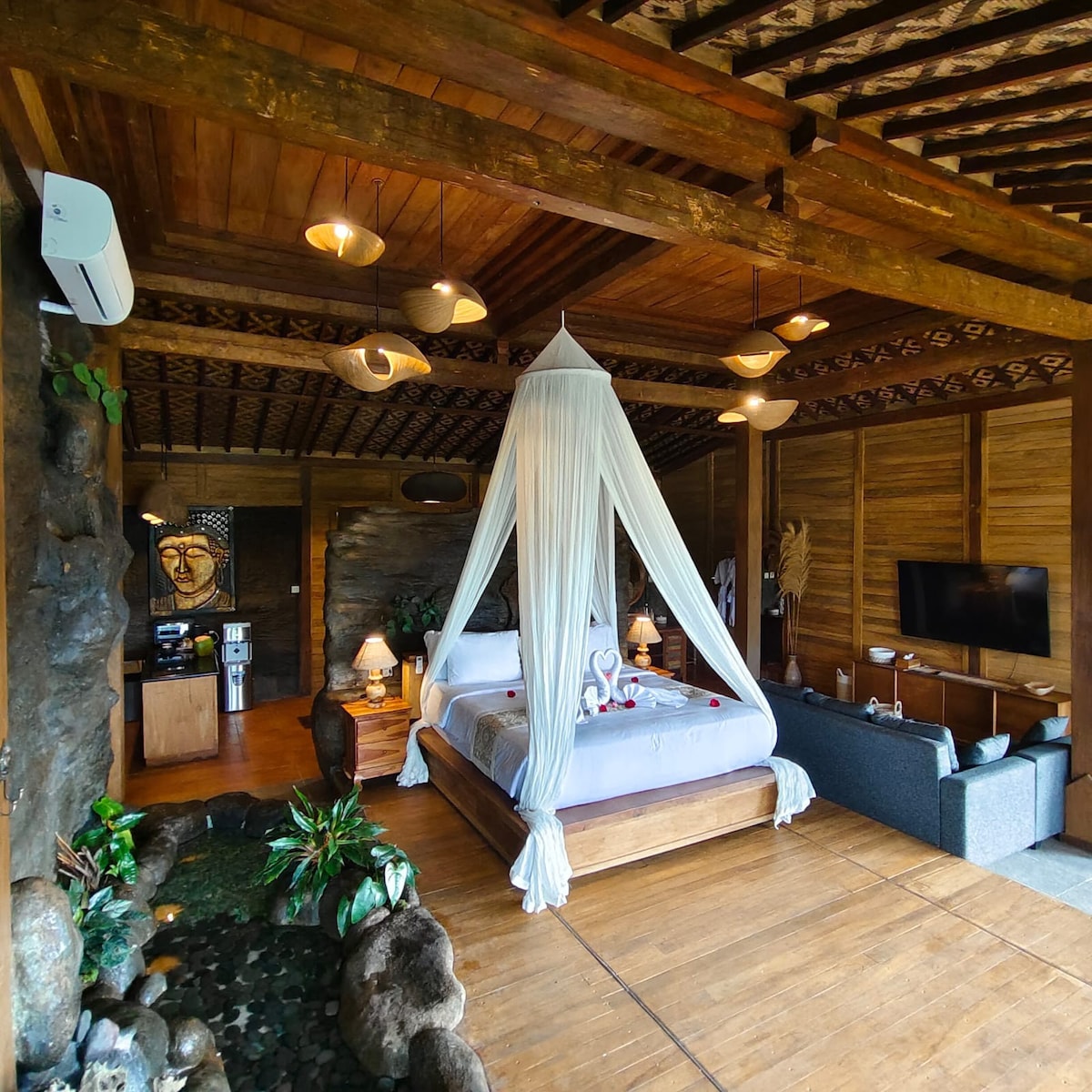 Наслаждайтесь прекрасной атмосферой в середине джунглей в традиционной деревне под названием Тампаксиринг, которая является одним из самых живописных мест на Бали. Мы решили построить прекрасное высококачественное бамбуковое жилье, которое даст нашим гостям возможность насладиться отдыхом с прекрасным окружением природы и в то же время роскошью и уютным.