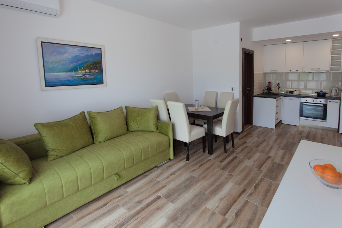 Красивая квартира с прекрасным видом на залив Бока и Котор. Квартира современная меблированная, с террасой, идеально подходящей для спокойного отдыха с отличным расположением. Пляж находится в 50 метрах от объекта. Мы находимся в 1,4 км от Старого города, в Пркандж. Госпиталь,полиция и пост находятся в 300 метрах. Банки находятся в Старом городе. Ближайший супермаркет находится в 300 метрах. Аэропорты находятся на расстоянии: Тиват - 7 км, Подгорица - 90 км, Чилипи(Хорватия) - 70 км. Добро пожаловать ,Котор - это история в живописном заливе