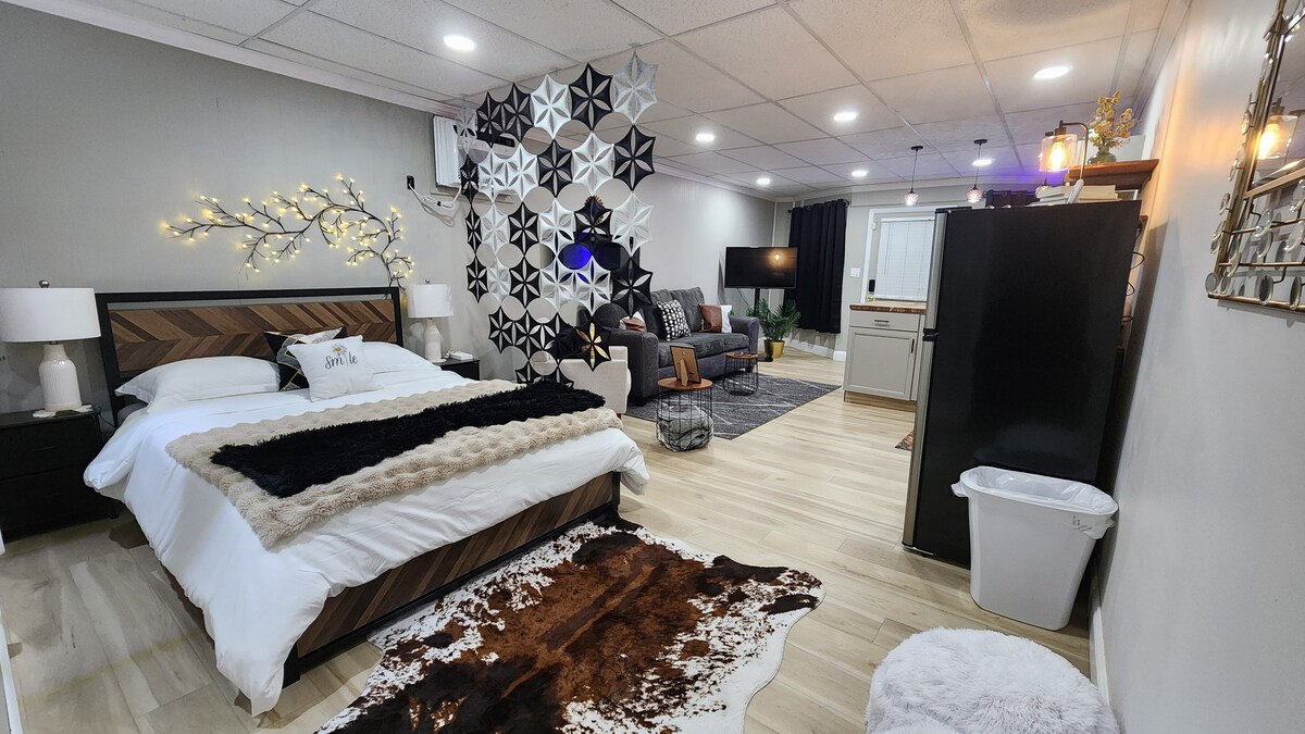Этот отремонтированный люкс, расположенный на задней половине двухуровневого дома, выходит на наш лесистый участок площадью 26 акров и в нескольких минутах ходьбы от небольшого пруда. Здесь есть 2 крыльца с отдельным входом. В этом люксе есть открытая зона с двуспальной кроватью размера King size, кухней, столовой и гостиной, 1 ванной комнатой и прачечной. Есть дополнительная спальня с двуспальной кроватью, собственным телевизором и запирающейся дверью. Жилье находится в 15 минутах от 2 крупных больниц, Университета Маршалла, центра Хантингтона и торгового центра Huntington Mall.