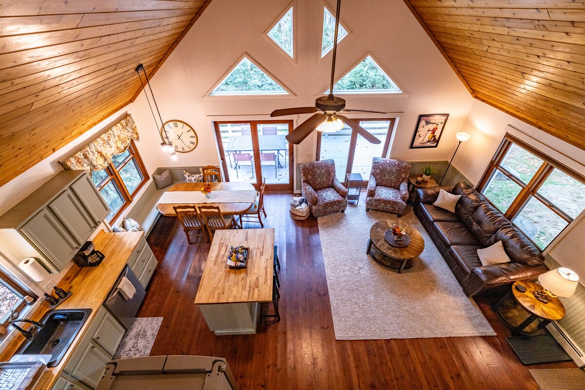 Просыпайтесь под звуки стремительных водопадов прямо за вашей стеклянной стеной в этом романтическом крошечном доме на берегу в Нори, штат Мэн! Частное джакузи с видом на реку, прозрачный газовый камин, уютная приподнятая двуспальная кровать размера Queen size с видом на водоем, душ на открытом воздухе, гамаки и прямой выход к пешеходным тропам. Полная уединенность — соседей не видно. Современная кухня, полы с подогревом, быстрый Wi-Fi и продуманные детали для пар или одиночных путешественников. Романтический отдых рядом с Сандей-Ривер: горнолыжные трассы, гольф и приключения в Мэне. Оазис природы