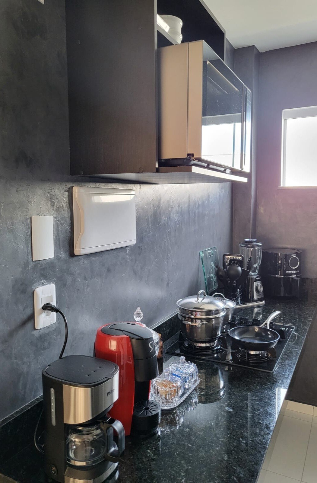 Новая и современная студия предлагает комфорт и безопасность. К услугам гостей 1 кровать размера Queen size, 1 диван-кровать, кондиционер, телевизор со Smart TV, Wi-Fi, кухня с мини-баром, микроволновой печью, чайником, посудой и другими принадлежностями для быстрого приготовления еды. Расположена в центре Vitória da Conquista, она имеет гараж, электронный замок для автоматического прибытия/выезда. В здании есть камеры, цифровой замок. Отдохните в стильной, стильной и безопасной обстановке. Элегантное Впечатление в этом хорошо расположенном месте - стильное Впечатление.