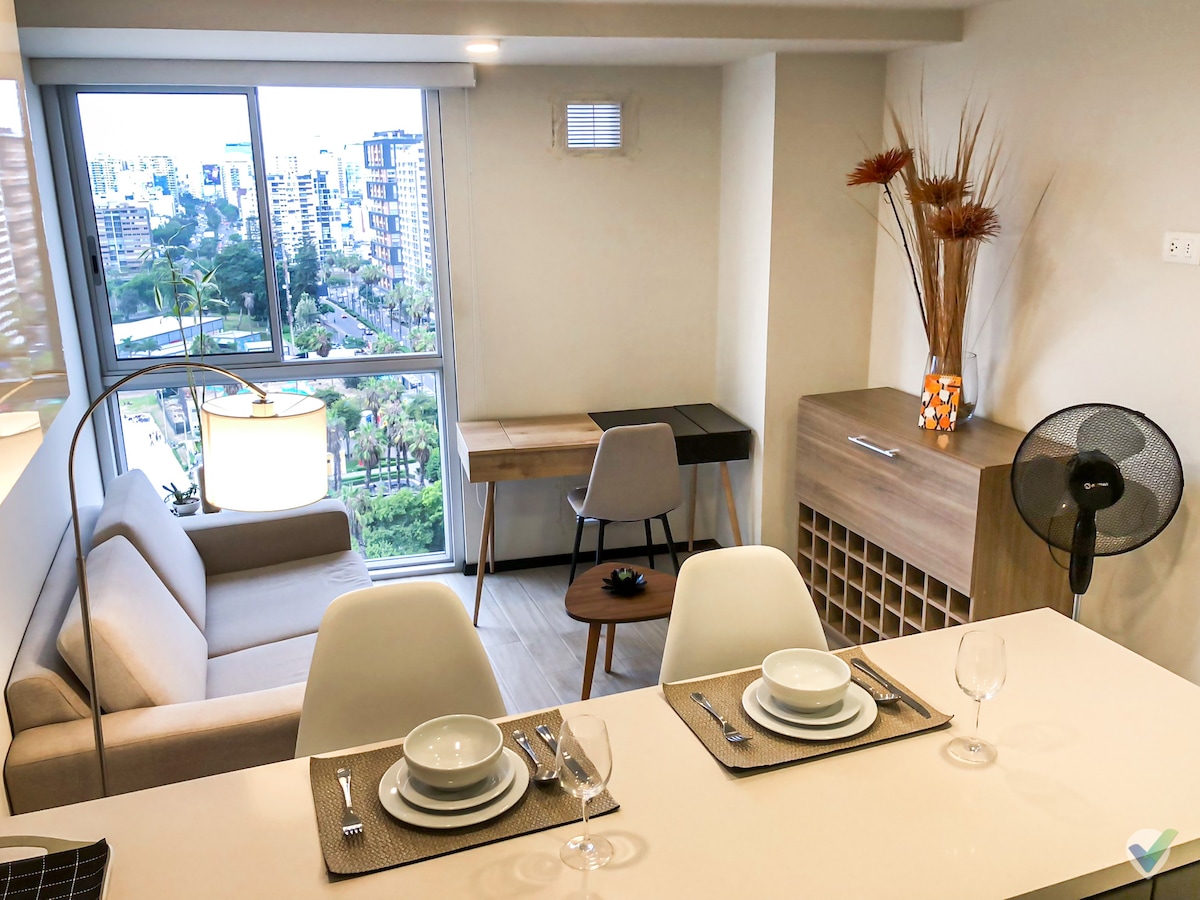 Precioso departamento super funcional frente al Malecon de Miraflores con hermosa vista al mar y parque. Cuenta con un cuarto con cama king, 1 baño completo con ducha, sala, comedor y kitchenette completo con refrigeradora, microhondas, cocina y utensilios para cocinar. Cuenta con lavaseca para ropa y plancha . Sofa cama Al frente del departamento hay un precioso parque y la zona es ideal para salir a caminar o a correr. Fácil acceso a supermercados Wifi gratis Seguridad 24 horas