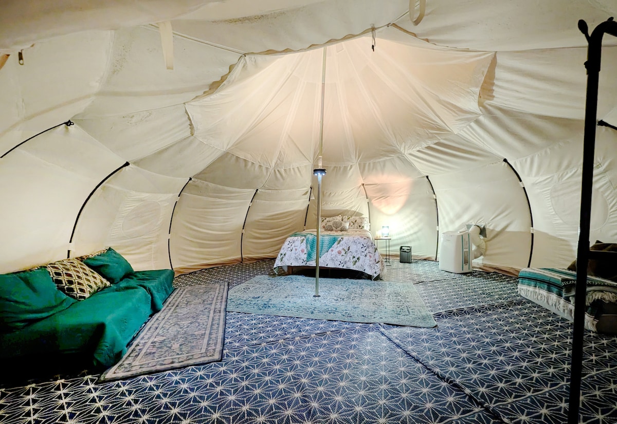 Отдохните на природе и познакомьтесь с умиротворением в нашем спокойном усадьбе. Из вашей частной палатки, расположенной у безмятежного пруда, открывается потрясающий вид на ночное небо с уютной террасы. Отдохните в палатке с подогревом и портативным кондиционером, расслабьтесь в роскошном джакузи с соленой водой или освежитесь в нашем нехлорированном бассейне. Насладитесь костровищем для волшебных вечеров под звездным небом. Ванная комната поблизости и мини-кухня - наш приоритет. Бронируйте сейчас для незабываемого побега!