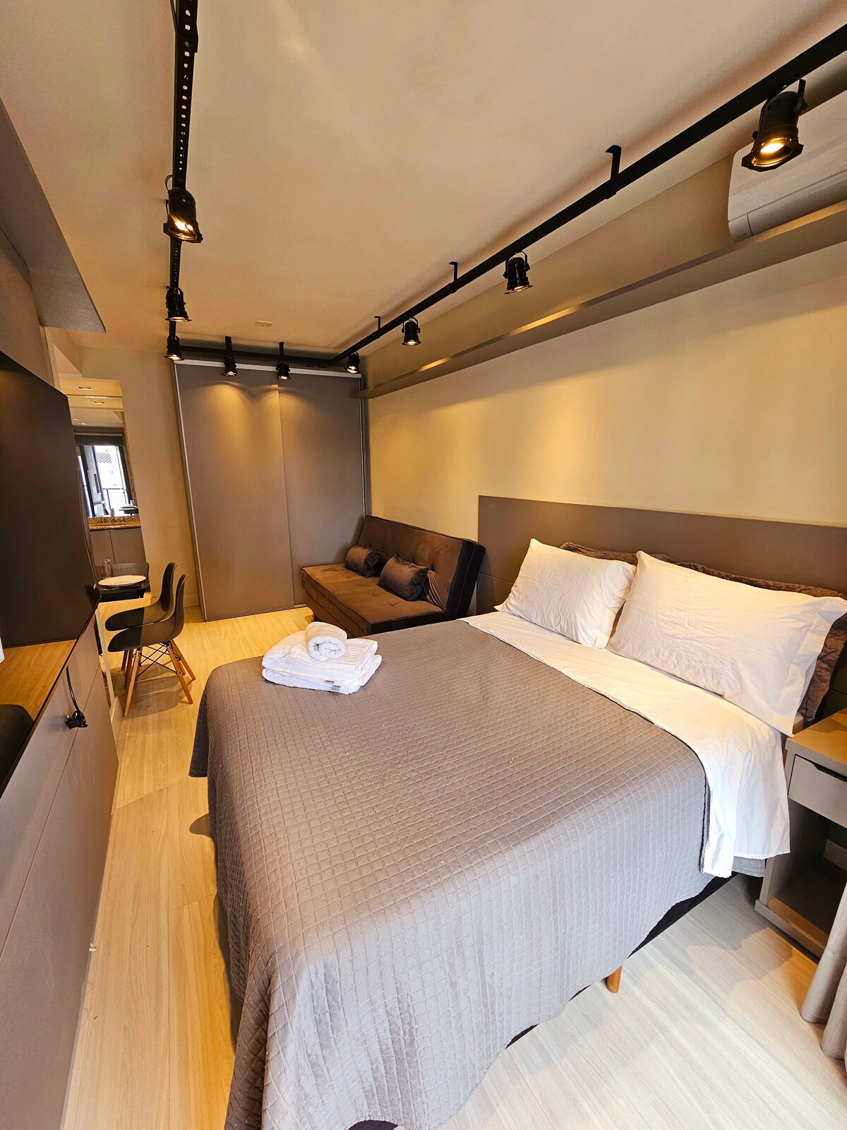 Studio Premium no luxuoso Diamond Tower, Batel. Acomoda até 2 pessoas com cama de hotel, ar-condicionado, cozinha equipada e enxoval 5 estrelas e uma sacada deliciosa. 🚗O imóvel possui garagem com serviço de valet, incluso na estadia como cortesia. É necessário deixar a chave do veículo com os manobristas. Prédio incrível com coworking, rooftop com vista deslumbrante e lavanderia. Atendimento Urooms 24h. Viva Curitiba com conforto e estilo!