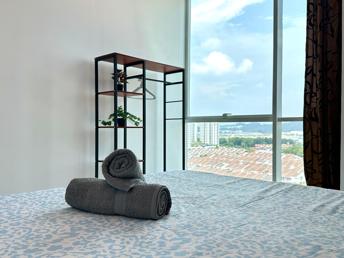 Luxury High-Floor Condo with Seaview | 15 min to Airport Experience comfort and style in this 1,433 sqft high-rise condo with a private balcony offering stunning sea and city views — and even views of airplanes in the distance. Located just 15 minutes from Penang International Airport, 2 minutes from Penang Second Bridge, and 10 minutes from Queensbay Mall. Perfect for business travelers, couples, or families.