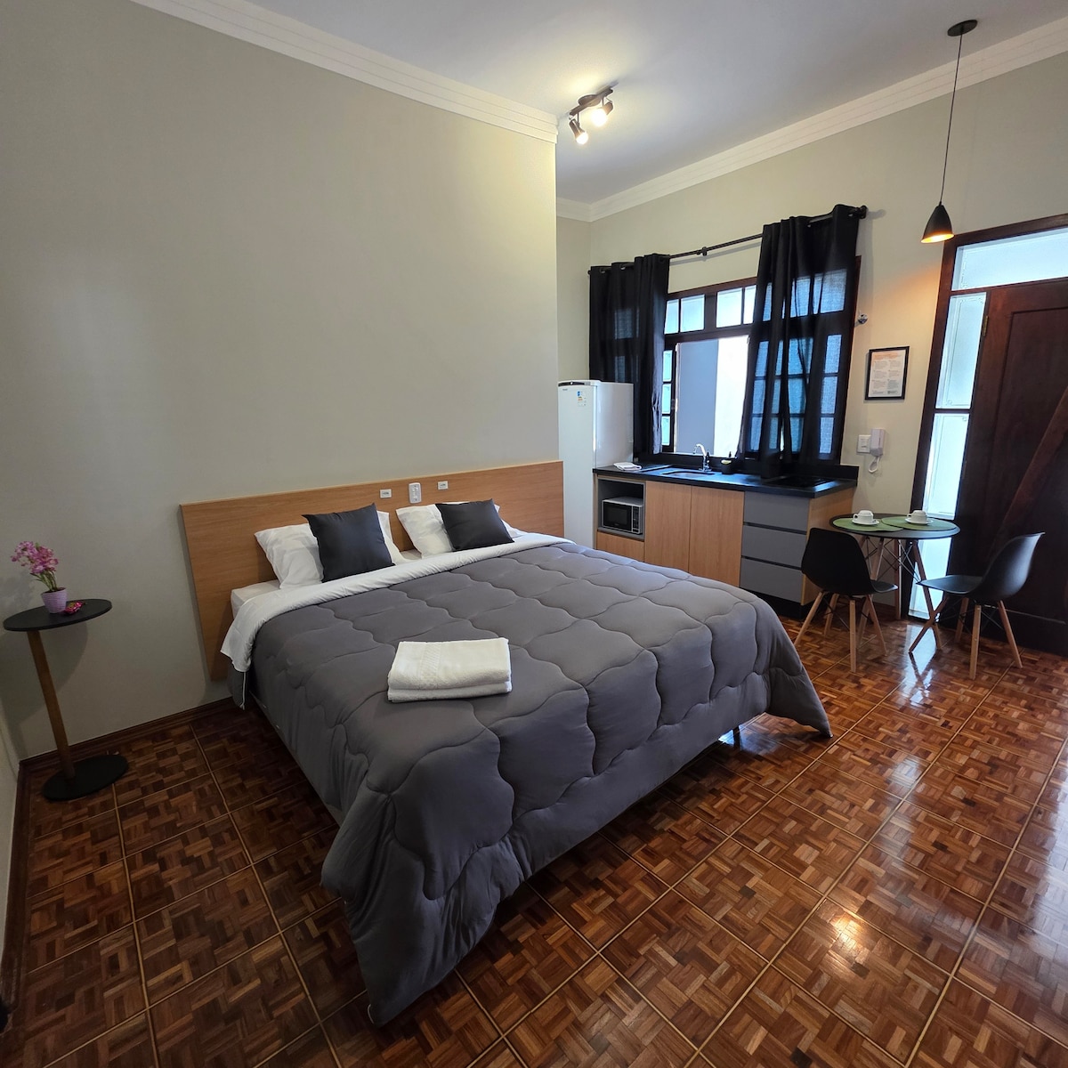 Studio aconchegante e bem localizado em Bauru, um lugar único que tem um estilo próprio. Nosso Studio oferece conforto e tranquilidade, com localização estratégica. O espaço conta com: Cama de casal aconchegante; Roupas de cama de qualidade; (fornecemos toalha). Cozinha equipada com geladeira, microondas, cooktop e utensílios para facilitar o seu dia a dia; TV Smart; Wi-fi. Espaço para home-office;