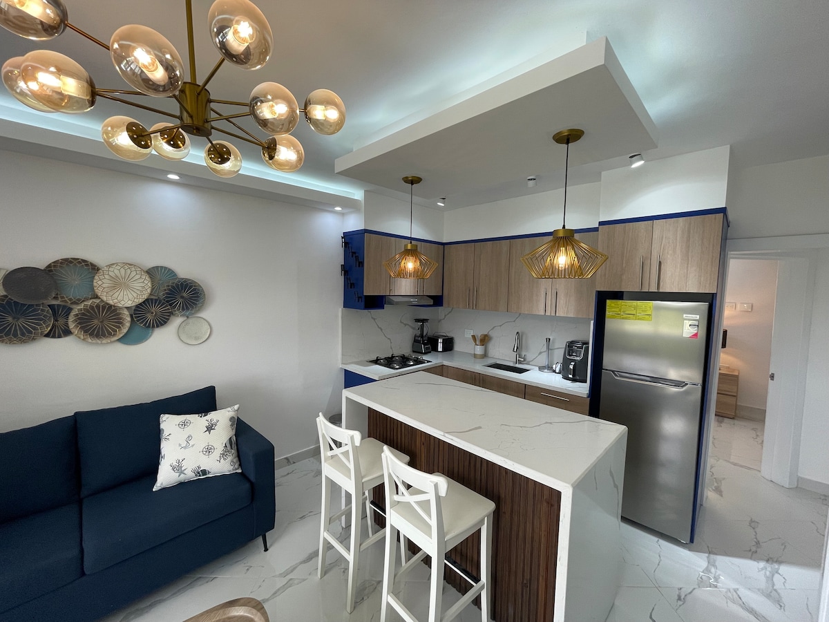 3 минуты пешком до частного пляжа. Отдохните в тропическом раю с пляжем категории «Голубой флаг», расслабьтесь, лежа под пальмами , прогуляйтесь по белоснежному пляжу, поплавайте в кристально чистой бирюзовой воде и насладитесь самым впечатляющим пейзажем в Байяибе, Доминиканская Республика. Красивая и уютная квартира с полным оборудованием рядом с пляжем, с двумя 2 спальнями и 2 ванными комнатами, полным оборудованием для размещения до 6 человек. Вам и вашей семье понравится это место.