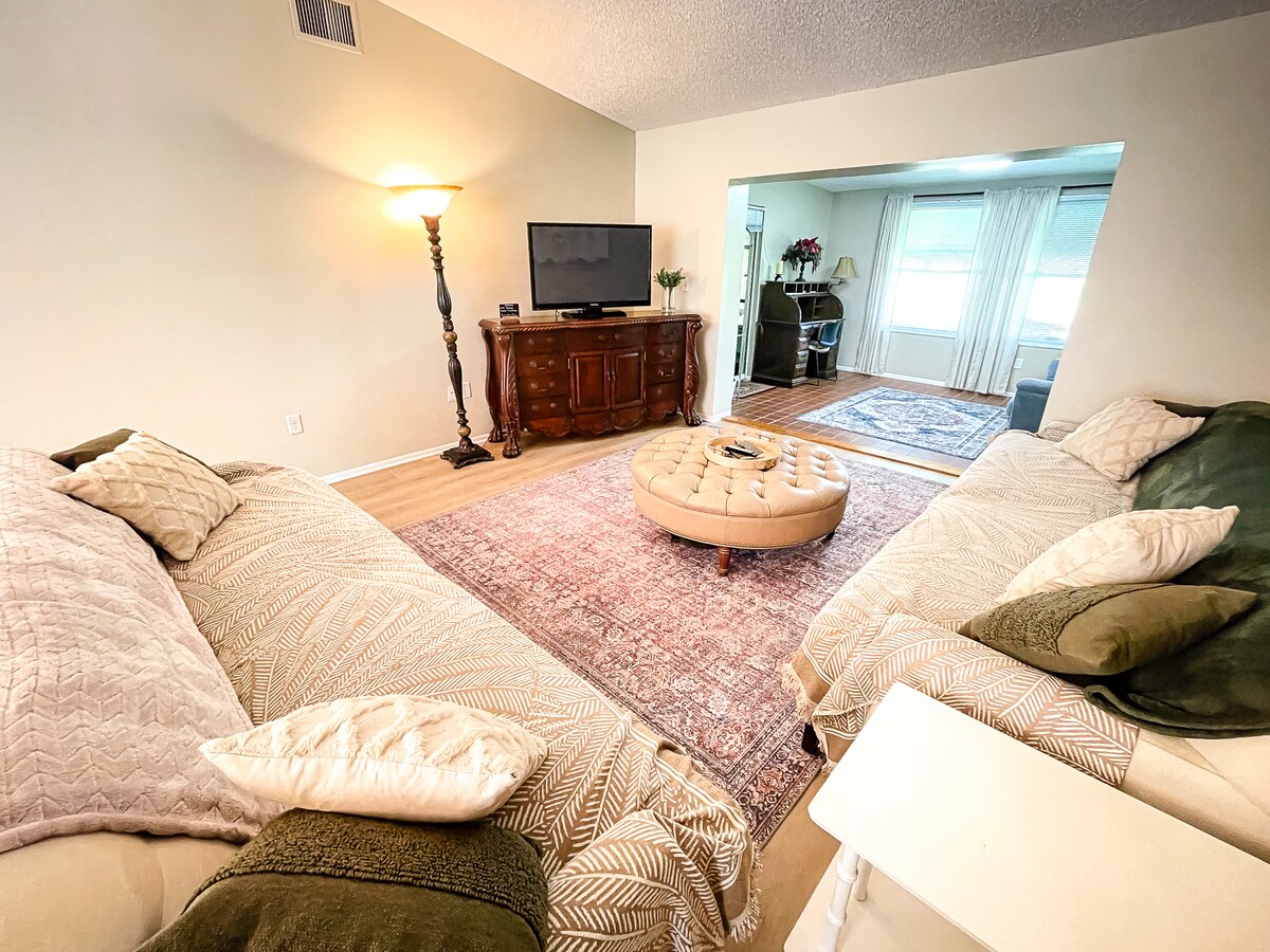 Расслабьтесь в этом уютном доме с 2 спальнями и 1,5 ванными комнатами. В каждой спальне есть телевизор и кондиционер. Еще один кондиционер расположен в гостиной. В одной спальне установлена кровать размера Queen size и специальная рабочая зона. В другой спальне есть две односпальные кровати. Посмотрите любимые фильмы в гостиной или выпейте на крыльце с видом на красивый огороженный задний двор. Полностью укомплектованная кухня и гриль позволят вам почувствовать себя как дома. Собаки приветствуются, но ознакомьтесь с правилами перед бронированием.