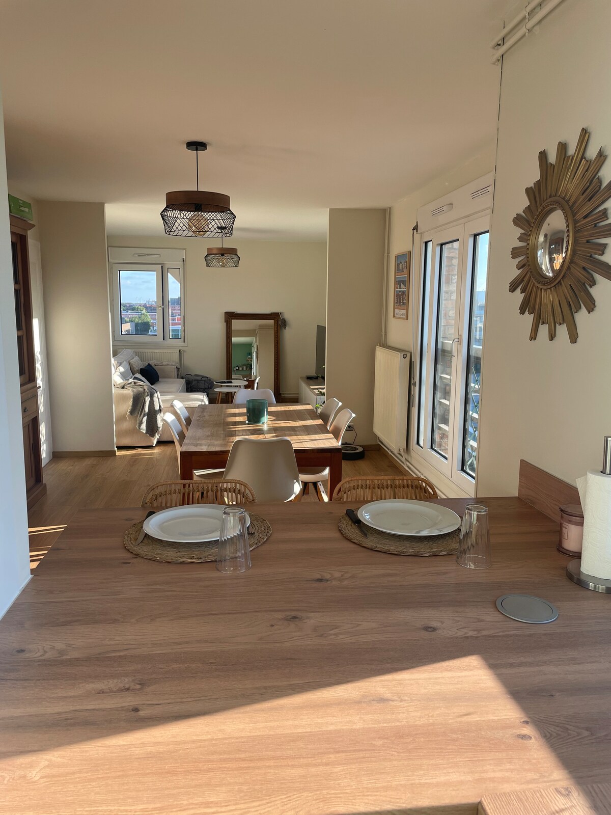 Duplex situé au 5eme et dernier étage d’une résidence calme au cœur de Dunkerque. Il possède 3 chambres et deux salles de bains. Tous les commerces sont à proximité immédiate, marché 2 fois par semaine en bas de l’immeuble, théâtre, bibliothèque. La plage se trouve à 15 minutes à pied. Le réseau de bus est gratuit sur toute l’agglomération. Place de parking souterrain gratuit. Le ménage doit être fait par les voyageurs, si cas contraire le spécifier lors de la réservation facturer 60€ en sus