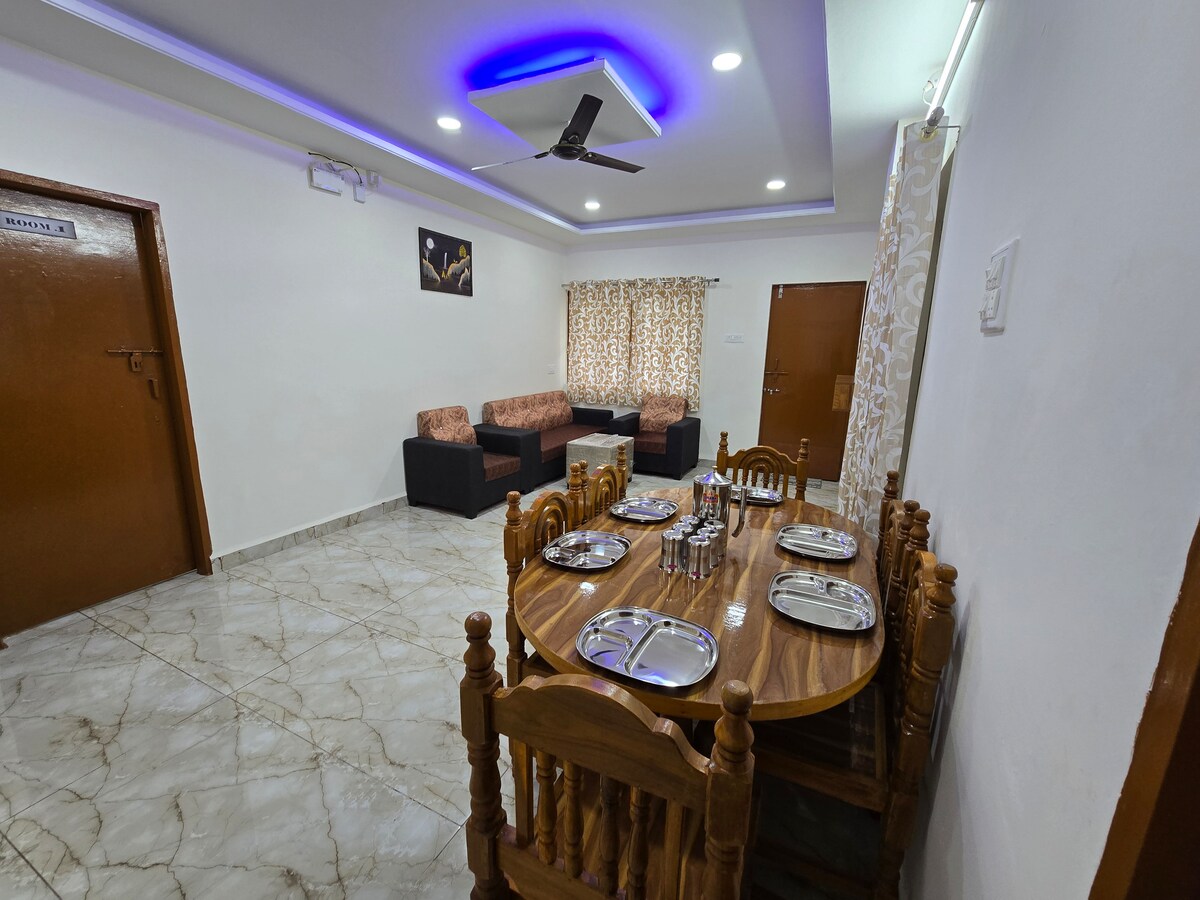 Добро пожаловать в Rajas Bhaktalay, ваше просторное и комфортабельное жилье в центре Колхапура. Наш полностью оборудованный дом расположен всего в 1,2 км от культового храма Махалакшми и идеально подходит для семей, паломников, туристов и больших групп, ищущих спокойное и удобное жилье. В жилье есть три хорошо оборудованные комнаты, пять кроватей и достаточно места для отдыха. Для больших групп мы предоставляем дополнительные матрасы, чтобы с комфортом разместить до 16 гостей, гарантируя всем спокойный отдых.