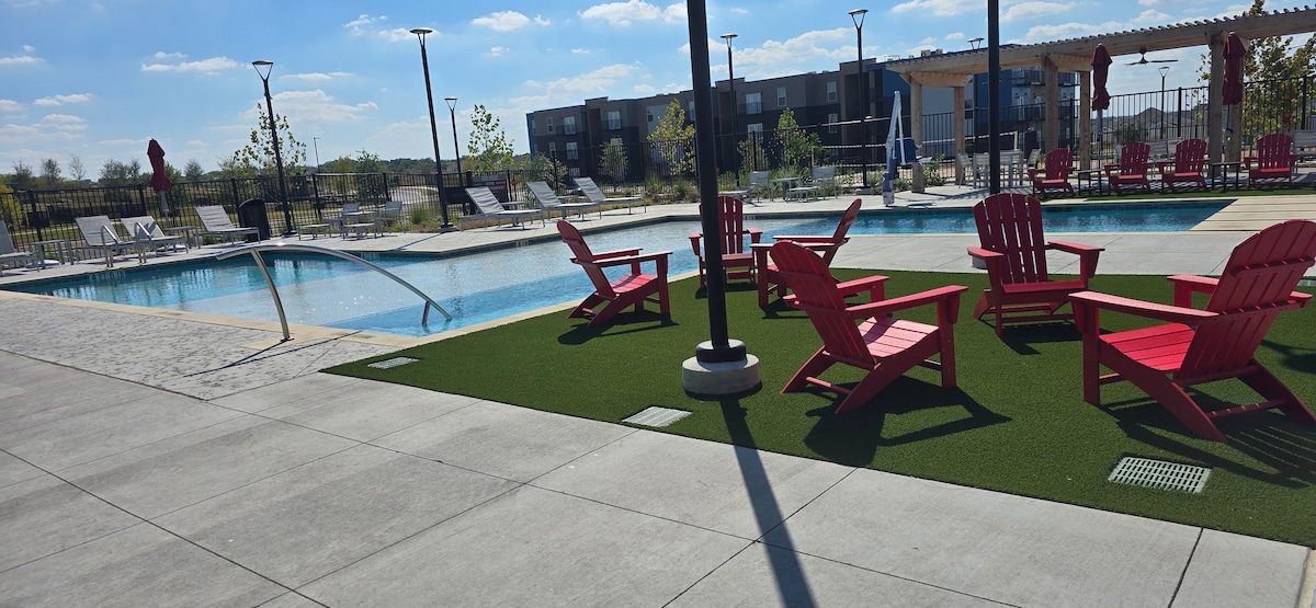 Free: Fast Wi-Fi Free: Gym Access Free: Parking Free: Coffee Station Free: Pool Access 24/7 Access to Amenities 65" Smart TV Resort-style pools/gym/grilling stations/outdoor activities/VR game room/lounges/conference room. Easy access to I-35. Location Minutes to Key Destinations: Baylor Scott & White Medical Ascension Hospital Fort Cavazos base Dell Diamond stadium Round Rock Complex Blue Hole Park San Gabriel Park Stillhouse Hollow Lake
