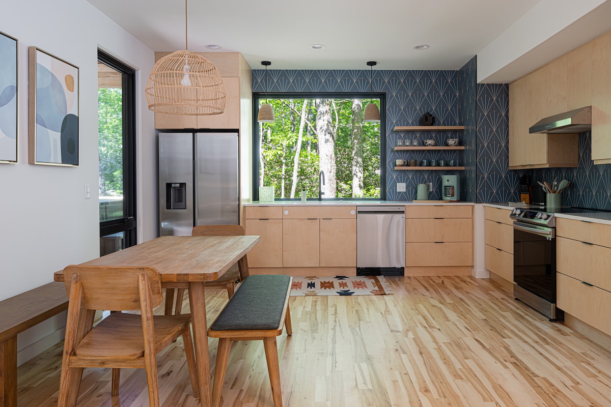 Kick back and relax in this calm, stylish space. This newly constructed, Scandinavian inspired home makes you feel like you've gotten away from it all, while only being 12 minutes from downtown Asheville. Relax in the hot tub on the deck surround by the mountain laurel canopy, snuggle up by the fireplace and watch a movie, or just bathe in the forest through the floor to ceiling windows while you take your coffee in bed.