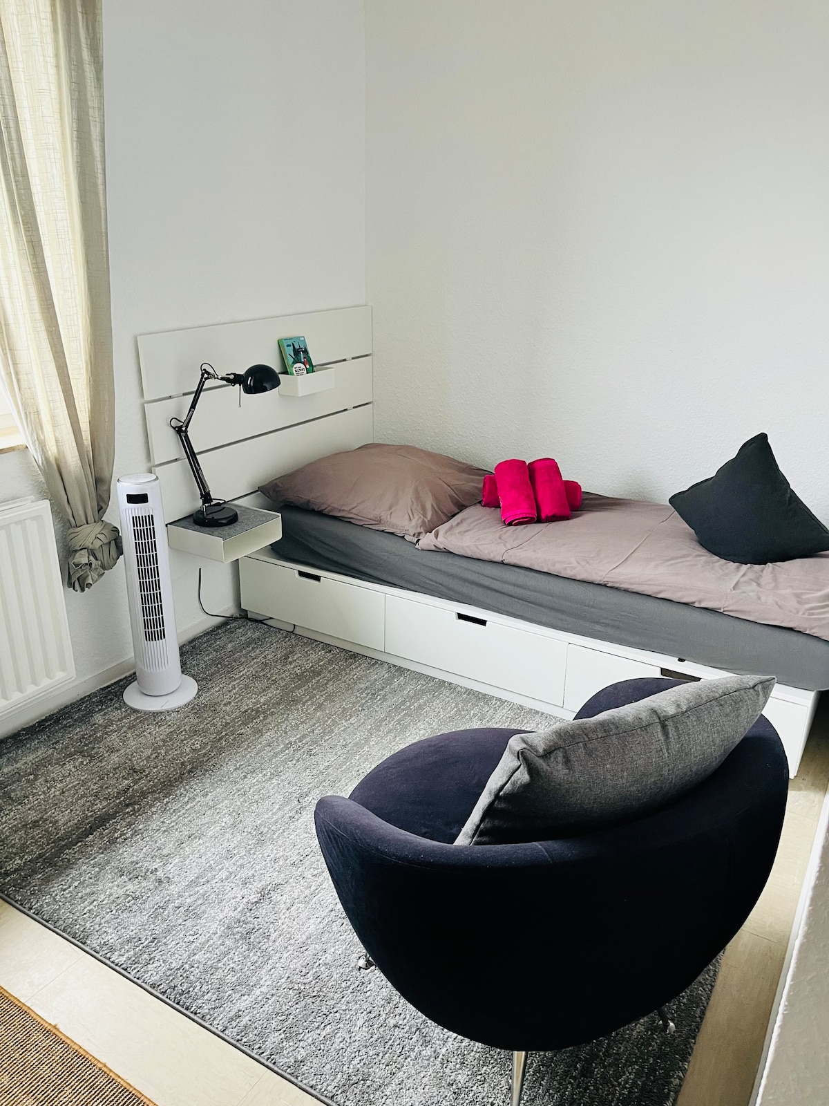 Красивая квартира с садом в центре, но тихая. Магазины и общественный транспорт прямо за углом. До Карлсауэ, центра города и музейного района можно дойти пешком. Квартира площадью 45 кв. м, имеет собственный вход с собственной террасой и собственной сауной. Перед домом на улице общего пользования есть бесплатные парковочные места. В саду велосипеды можно безопасно припарковать и накрыть.