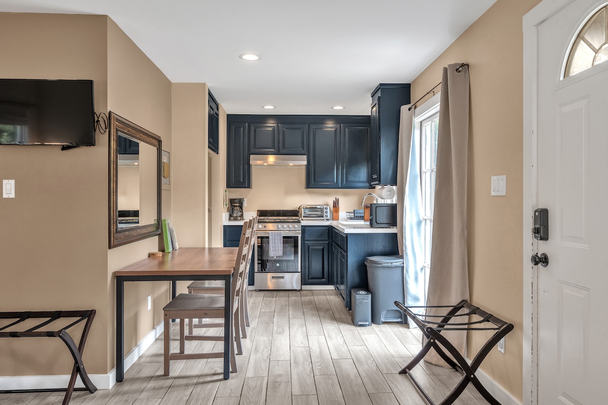 Наша недавно отремонтированная студия Eurostyle имеет высококачественную дизайнерскую мебель, эклектичное искусство и частную террасу. Замочитесь в джакузи или выпейте на палубе и полюбуйтесь потрясающими видами на залив и Сан-Франциско. Приготовьте ужин в хорошо оборудованной мини-кухне и поужинайте внутри с лучшим в своем классе электрическим камином/обогревателем Dimplex. Расслабьтесь и насладитесь компанией или посмотрите телевизор в полностью кожаной мебели для гостиной. Роскошная кровать из натурального дерева с матрасом Casper memory.