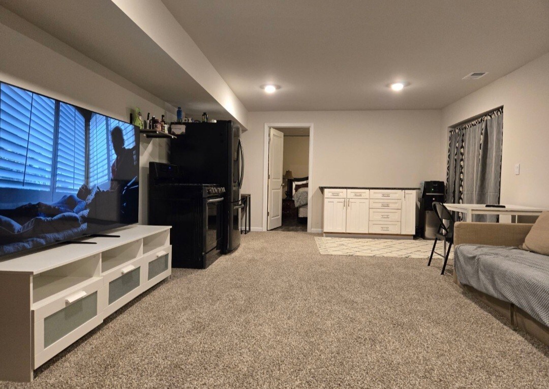 Квартира с двумя комнатами на первом этаже. Никаких ступенек. Отдельный вход от главного дома. Отдельный вход и парковка. Есть прихожая с двуспальной кроватью, двумя односпальными кроватями, диваном и полным холодильником. В отдельной гостиной есть двуспальная кровать размера Queen size, телевизор, ванная комната, письменный стол, стол, микроволновая печь, конвекционная печь, фритюрница, газовый камин. Духовки нет. Снаружи есть большая зона для использования наружного газового гриля, стола для пикника и костра. Собаки разрешены и должны быть на поводке на улице. Пожалуйста, НИКАКИХ КОШЕК. У владельца аллергия