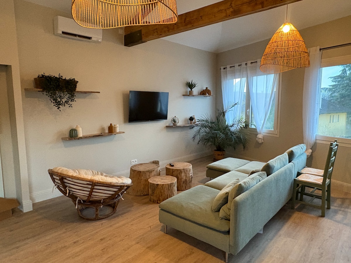 Beautiful modern 70 m² apartment with a terrace offering stunning views of the Belledonne mountain range 🏔️. Located in Saint-Ismier, just 15 minutes from Grenoble by car 🚗, ideal for 4 guests with a double bed 🛏️ and sofa bed 🛋️. Fully equipped kitchen 🍳 with Dolce Gusto ☕, bathroom with bathtub 🛁, air conditioning ❄️, and hotel-quality linens included 🧺. Enjoy the terrace with dining area and breathtaking panorama. Comfort and brightness guaranteed!