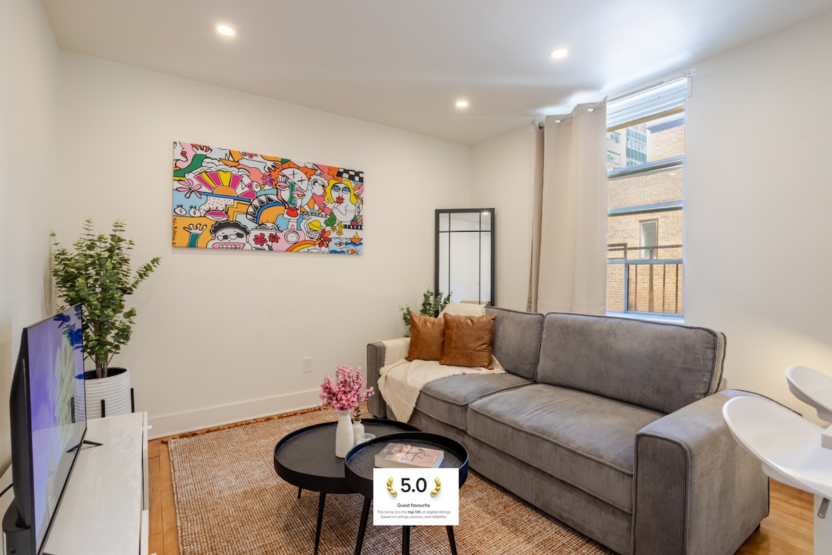 Добро пожаловать в нашу стильную квартиру с 2 спальнями в Монреале. Это недавно построенное жилье предлагает современный шарм и удобство для 6 гостей. Наслаждайтесь полностью оборудованной кухней, элегантной ванной и стиральной/сушильной машиной. Одна спальня обеспечивает гибкость, выходящую в гостиную. Расположенный в оживленном центре города, вы в нескольких минутах от местных достопримечательностей. Бронируйте прямо сейчас для незабываемого отдыха!