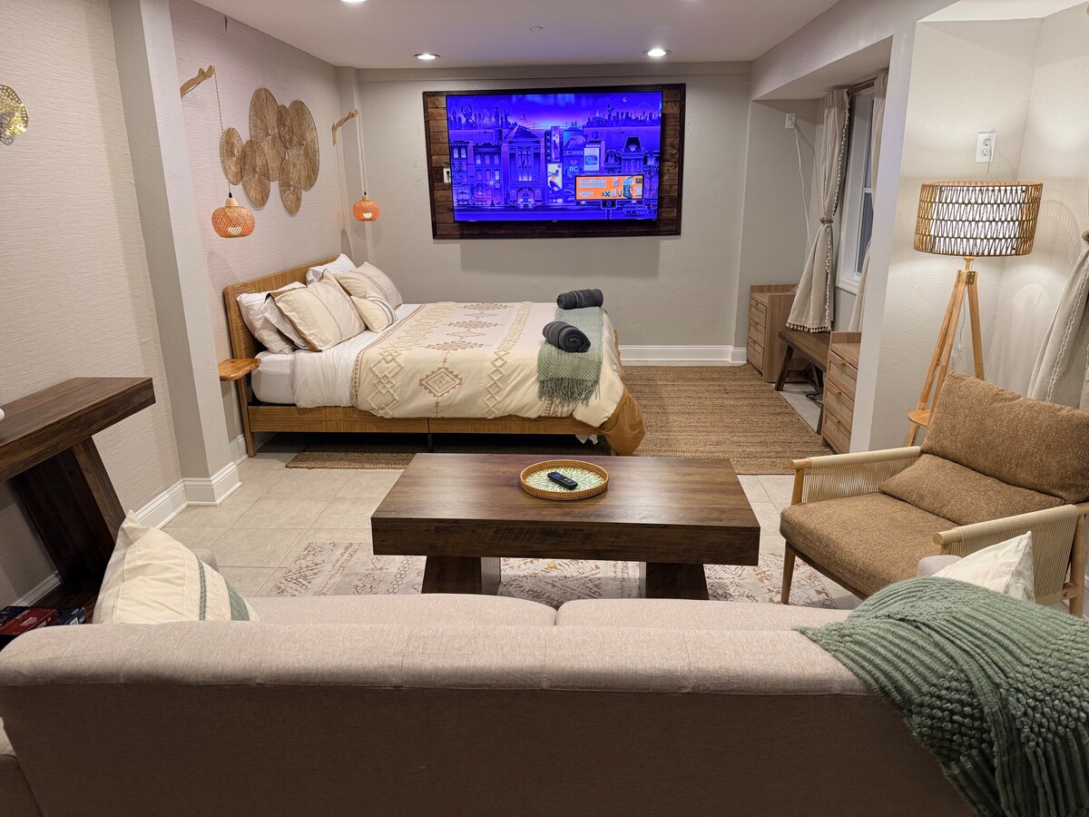 Добро пожаловать в наш уютный крошечный дом, расположенный на моем охраняемом заднем дворе, где двуспальная кровать размера Queen size обещает спокойный ночной сон, а наша хорошо оборудованная мини-кухня упрощает приготовление пищи. У вас будет бесплатная парковка на заднем дворе, расположенная всего в нескольких шагах от крошечного дома. Кроме того, у вас будет возможность собраться у костра на уютные вечера под звездами. Расслабьтесь с телевизором Smart TV и оставайтесь на связи с бесплатным Wi-Fi.