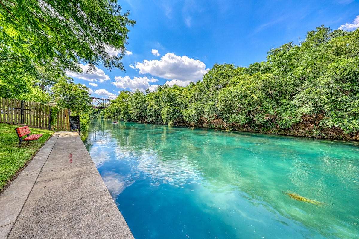 Welcome to The Wet Feet Retreat! This chic Comal riverfront condo in the heart of downtown New Braunfels offers a perfect blend of modern comfort and dreamy elegance. 2 bedrooms and 2 bathrooms, enjoy the best private river access on the Comal, a refreshing pool with river views, and easy strolls to downtown hotspots. Just steps across from Schlitterbahn waterpark and a short drive to Gruene, immerse yourself in the vibrant spirit of New Braunfels at The Wet Feet Retreat!