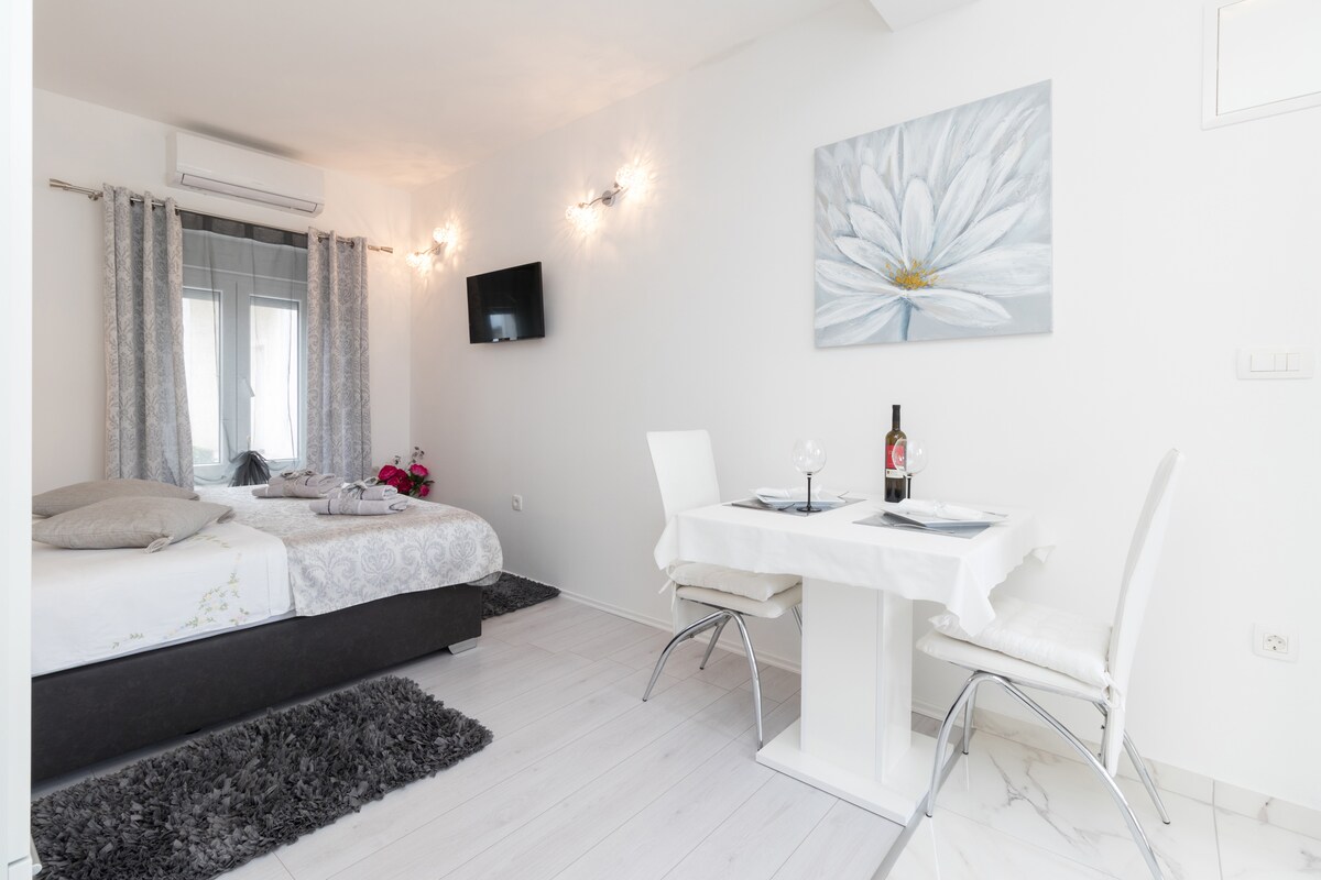 Роскошная квартира-студия с кухней, ванной, ванной, телевизором и кондиционером идеально подходит для двух человек. Бесплатная парковка также включена. Автовокзал, порт Гаженица и центр города находятся в 5 минутах езды на машине. Пляж находится в 300 метрах от квартиры.
