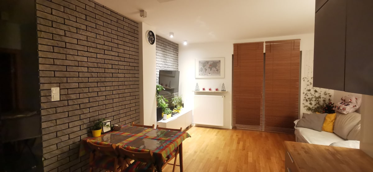Тихая и уютная квартира, расположенная в закрытом жилом комплексе в варшавском Тархоминине с очень хорошим сообщением (10 минут на трамвае до станции метро, трамвайная остановка прямо у здания). Преимуществом является очень большой балкон, позволяющий расслабиться. Большая и удобная ванная комната. В здании есть лифт, нет коммуникационных барьеров для людей с ограниченными возможностями. Хозяин предлагает трансфер из аэропорта Варшава Модлин за дополнительную плату
