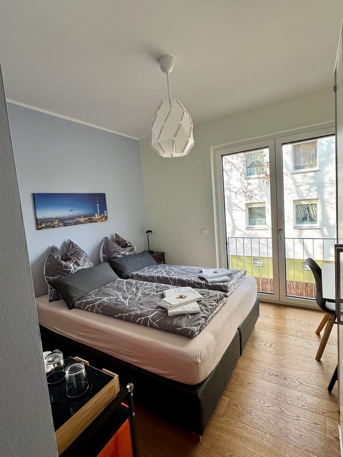 Bright and big apartment with a direct view to the bay of Rummelsburg. 1 bedroom with a large double bed Large living room with open kitchen and dining area All fully and exclusively equipped Bathroom with bathtub, shower cubicle and toilet, as well as a second guest toilet. Balcony with a view to the bay of Rummelsburg Lift Other rooms in the apartment are private and locked. Good access to public transport Plenty of free parking Variety of restaurants, bars and leisure activities