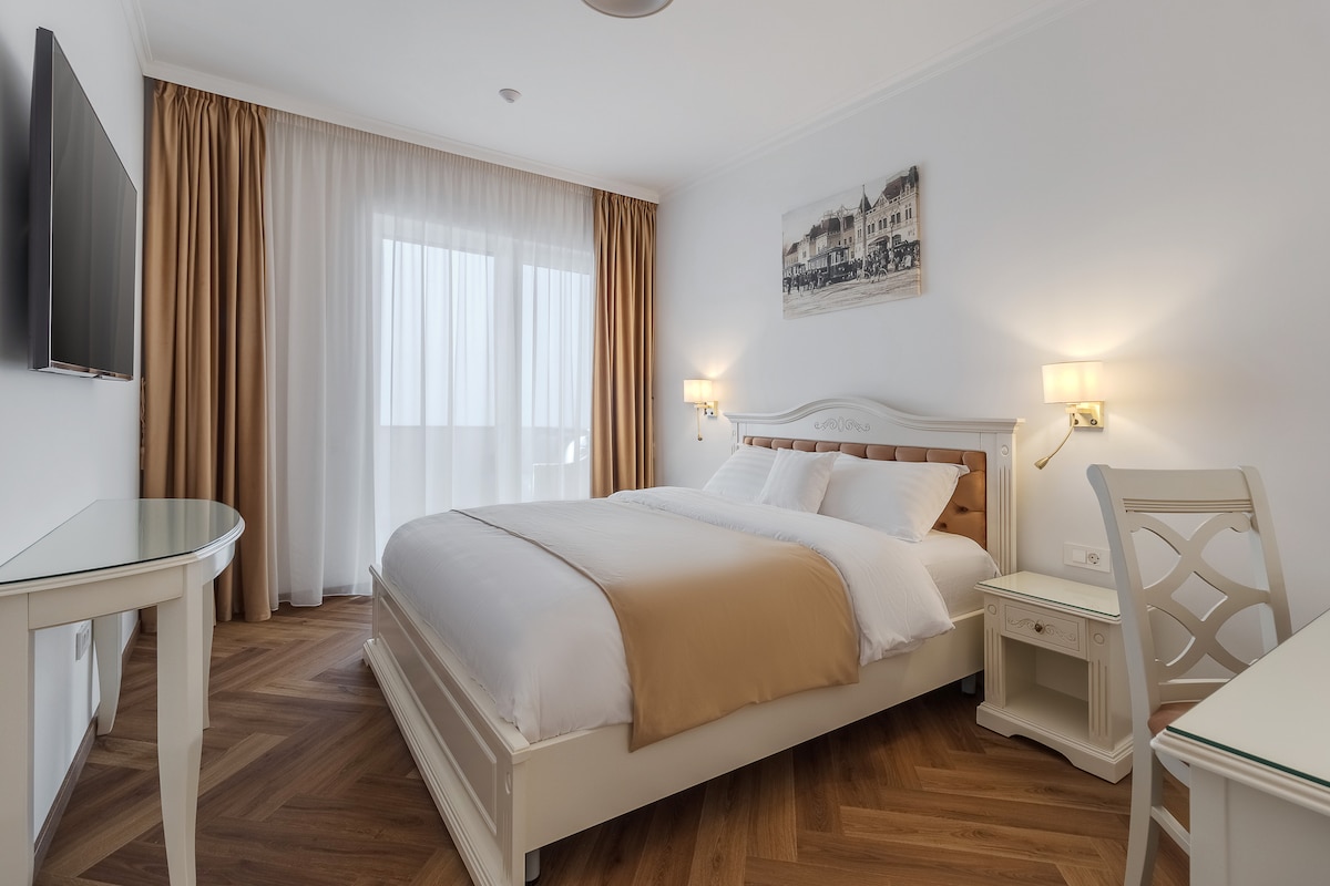 Apart-hotel elegant, situat ultracentral în Oradea, pe strada Aurel Lazăr nr. 9, ideal pentru turiști sau călătorii de afaceri. Camera dublă dispune de hol de acces, dormitor luminos cu pat matrimonial confortabil și baie privată modernă cu duș walk-in. Dotări: Wi-Fi gratuit, TV, birou, aer condiționat, încălzire și lenjerie de calitate. Locație excelentă, la câțiva pași de principalele atracții ale orașului.