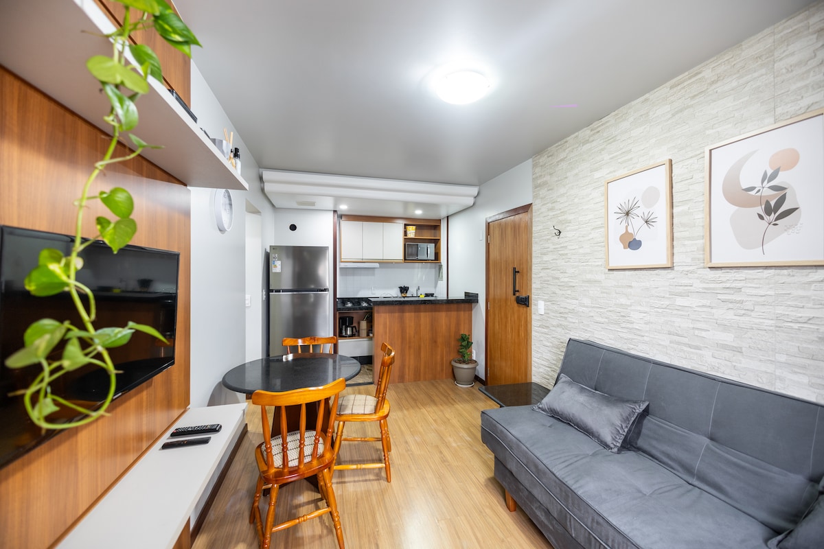 Познакомьтесь с Блюменау и остановитесь в нашем уютном жилье! Привилегированное место рядом с ДЕРЕВНЕЙ ГЕРМАНСКОГО ПАРКА, рядом с университетом FURB, пекарнями, ресторанами и рынками; Оснащена кухней, кондиционером, Smart TV, Wi-Fi и частным гаражом, находится в здании с бассейном Infinite Edge, фитнес-центром, игровой комнатой, зоной отдыха и Mercadinho; Со вкусом для тех, кто приезжает в прекрасный город Блуменау.