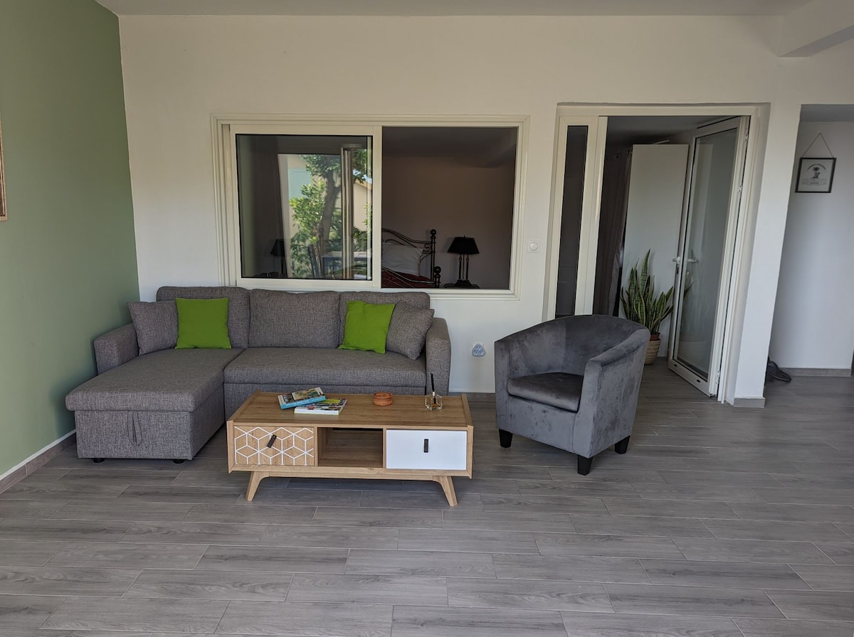 Простая студия, расположенная под нашим домом, на тихой тупиковой улице. Можно насладиться террасой у бассейна, особенно, чтобы поесть на свежем воздухе. Небольшой бассейн на открытом воздухе можно использовать только летом (с ноября по март). Гости запрещены. Небольшая мини-кухня со всем необходимым, небольшая ванная комната и кровать на 2 человек. Возможность приехать с 1 ребенком, потому что есть 1 щелчок. 10 минут на машине до UExpress, 5 минут до пекарни.