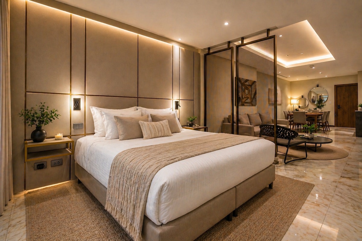 Насладитесь комфортабельным и стильным отдыхом в современных апартаментах на 18-м этаже с панорамным видом на город в Санта-Крус. Квартира идеально подходит для семей, деловых путешественников и групп. Здесь есть пространство, уединение, быстрый Wi-Fi и удобства курортного типа. Все это в безопасном высотном здании. В целях безопасности снаружи входа в квартиру установлена камера дверного звонка Ring, обращенная к внешнему коридору. В квартире нет камер. В кондоминиуме круглосуточно дежурит охрана.