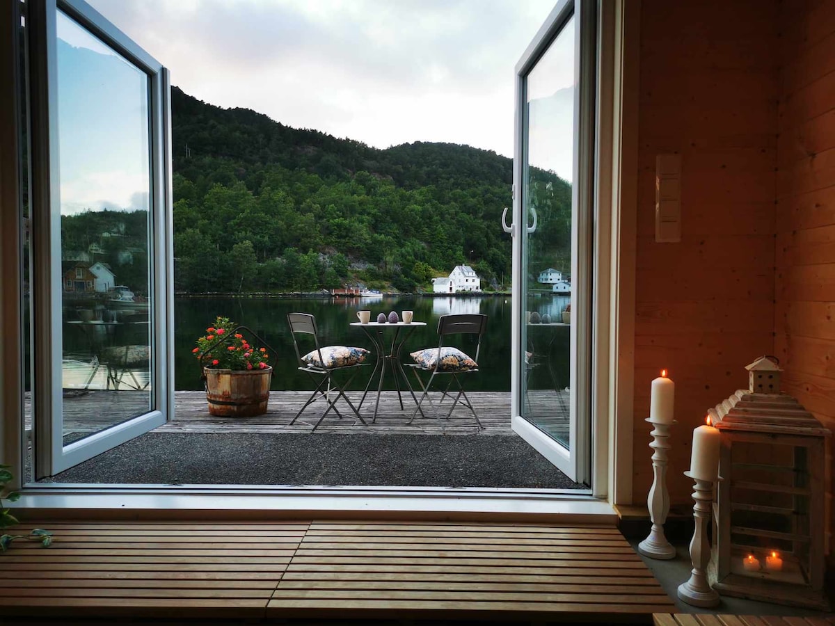 Уютный домик в Рорбу с лодочным причалом и сауной в Рольфснесе