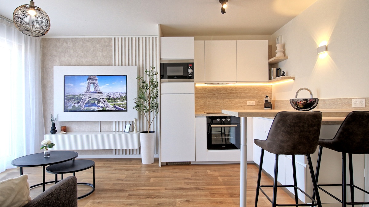 Студия площадью 20 м² на окраине Парижа с красивым естественным освещением и красивыми объемами (высокий потолок) в безопасной и новой резиденции 2025 года. Жилье расположено на первом этаже с окном, выходящим в небольшой сад с деревьями (нет соседей напротив). Идеально подходит для пар, одиночных или деловых путешественников.