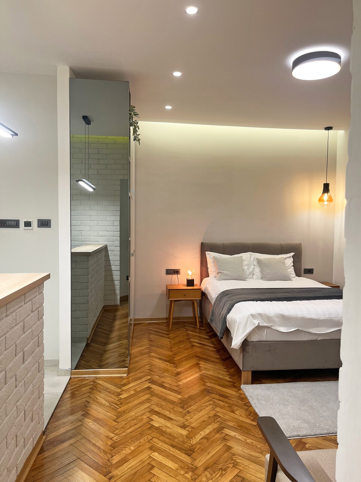 Skladan, moderan i lepo dizajniran studio za dvoje, okruzen svim gradskim desavanjima, a ipak pozicioniran na mirnoj lokaciji. Prostor je jedinstvena celina i sastoji se od dnevne sobe, kuhinje odvojene barskim stolom, radnim prostorm, predsobljem sa komfornim ormarom i kupatilom. Francuski balkon pruza lep i sirok pogled kao i dobru osvetljenost. Studio je u potpunosti renoviran, a namestaj je nov i moderan. Ovaj smestaj ce vam dati udobnost kakvu zasluzujete.