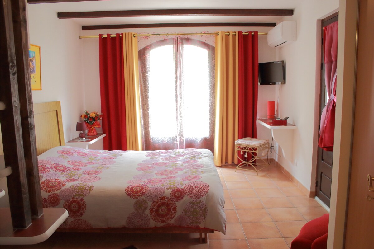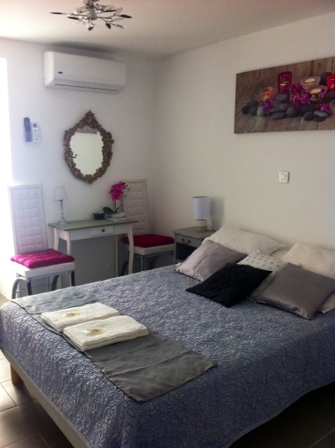 Двухместная спальня с кондиционером, собственной ванной комнатой (душ и туалет), мини-кухней, телевизором, отдельным входом на садовом этаже, террасой, частной парковкой, на участке площадью 1600 кв. м в тени столетних оливковых деревьев. Рядом рестораны. Бригитта предлагает столик d 'hôtes несколько ночей в неделю. Посуда подается в спальне или на террасе в соответствии с гигиеническими правилами.