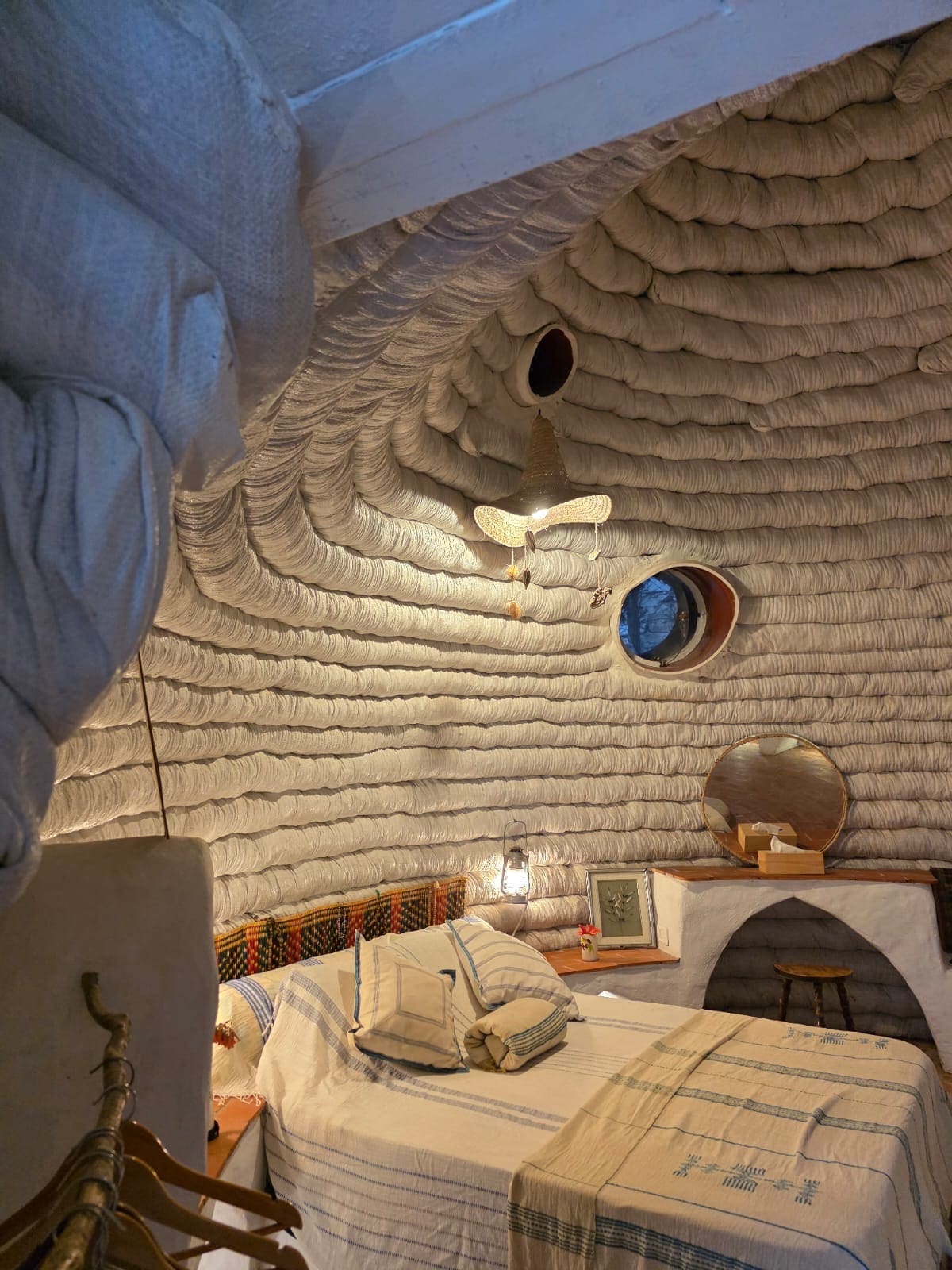 This is a truly special place, made up of several ecological buildings surrounded by greenery, olive trees, and flowers. At the far end of the garden, nestled among the olive trees, is the bedroom. It consists of a unique superadobe dome, creating a cozy and memorable stay. Right next to it, there is a private bathroom with a toilet and shower.