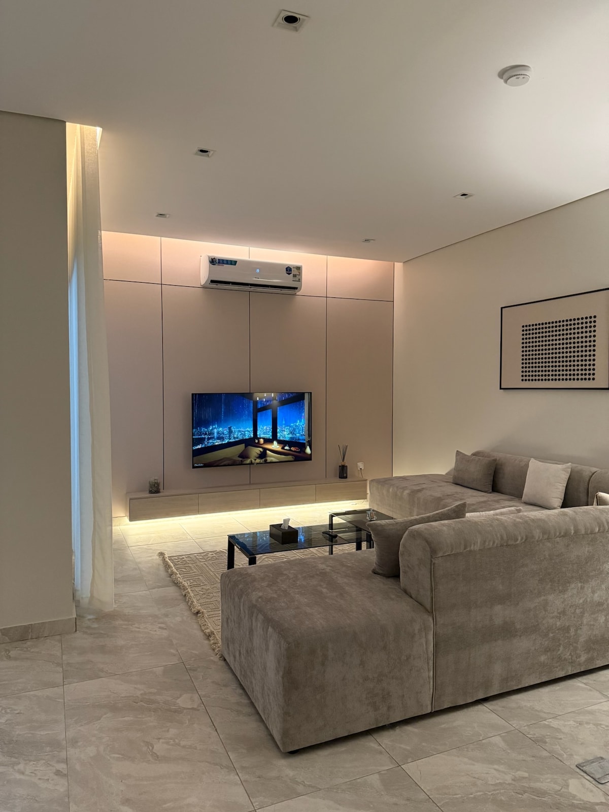 Добро пожаловать в нашу квартиру, которая предлагает вам исключительное пребывание, превосходящее ваши ожидания. В квартире есть спальня, оборудованная лучшими матрасами, а также отдельная гостиная с удобными диванами с 65-дюймовым смарт-экраном для наслаждения (Netflix, Shahid, BeIN) + Wi-Fi. Кухня полностью оборудована всем необходимым. Доступно наружное сидение с деревенским дизайном и отличным видом на финансовый центр, подходящее для проведения мероприятий и встреч с семьей и друзьями. Квартира оборудована для краткосрочного и долгосрочного проживания. Расположение прекрасное, в центре города, рядом с достопримечательностями, услугами и ресторанами.