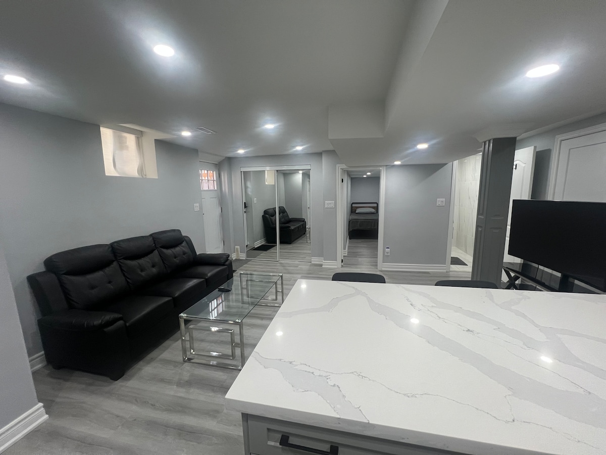 Добро пожаловать в свой дом вдали от дома! Этот цокольный этаж имеет отдельный вход и недавно построен с ванной комнатой и кухонными принадлежностями, просторной гостиной, обеденными зонами в помещении и на открытом воздухе, а также комфортабельной спальней. Наслаждайтесь современными удобствами, такими как Wi-Fi и 50-дюймовый телевизор с полностью платной подпиской Netflix. Ваше удобство - наш приоритет, с выделенным парковочным местом на подъездной дороге для гостей. Рядом находятся популярные рестораны, такие как Swiss Chalet, DQ и т. д.