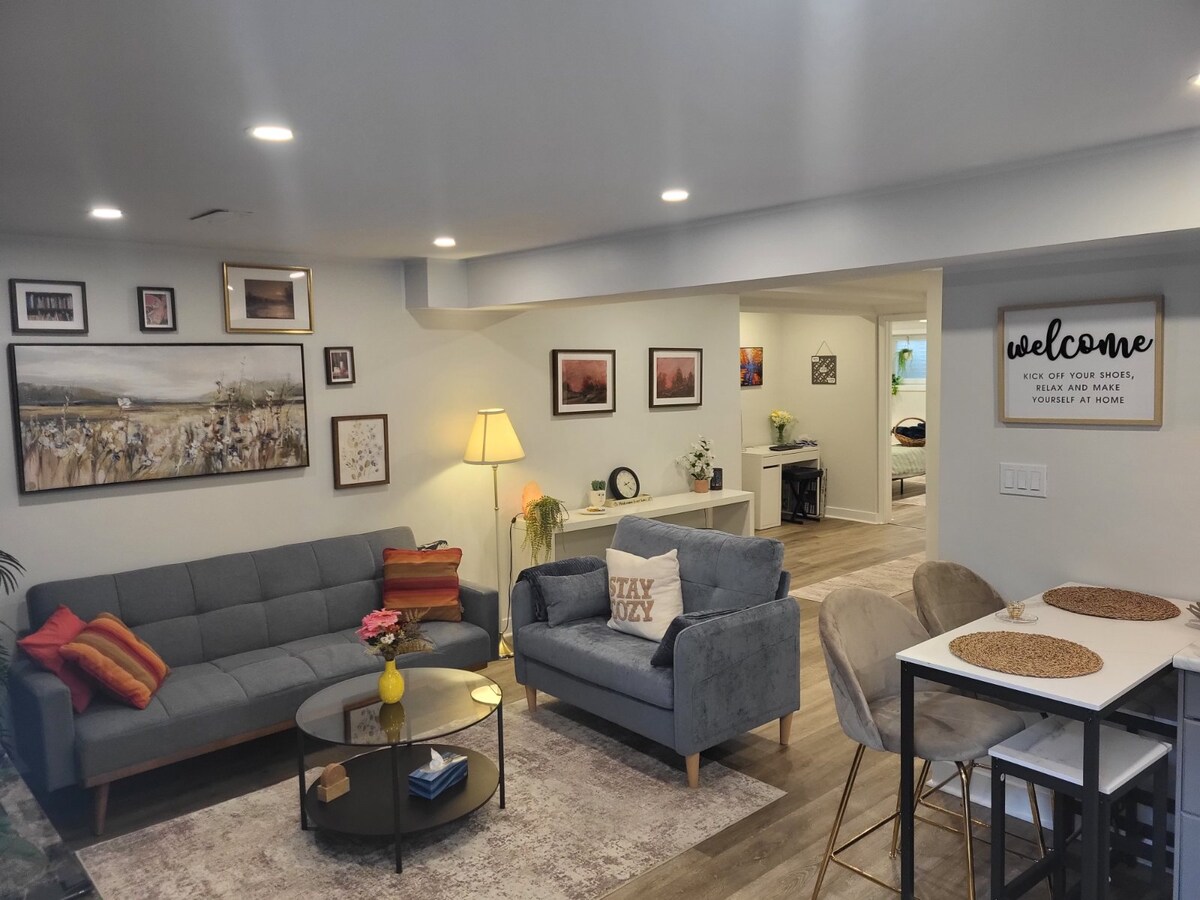 Насладитесь стильным и спокойным пребыванием в этом жилье с одной спальней на нижнем этаже, идеально подходящем как для отдыха, так и для деловых путешественников. С отдельным входом, парковкой и всем необходимым - ваш идеальный дом вдали от дома. К услугам гостей полностью оборудованная кухня, ванная комната, Интернет, телевизор Smart TV, один диван-кровать размера Queen size и один диван-кровать, а также функциональное рабочее место. В нескольких шагах от FreshCo, Walmart, ресторанов и услуг. В нескольких минутах от Vaughan Mills, Canada's Wonderland, больницы Cortellucci и общественного транспорта.