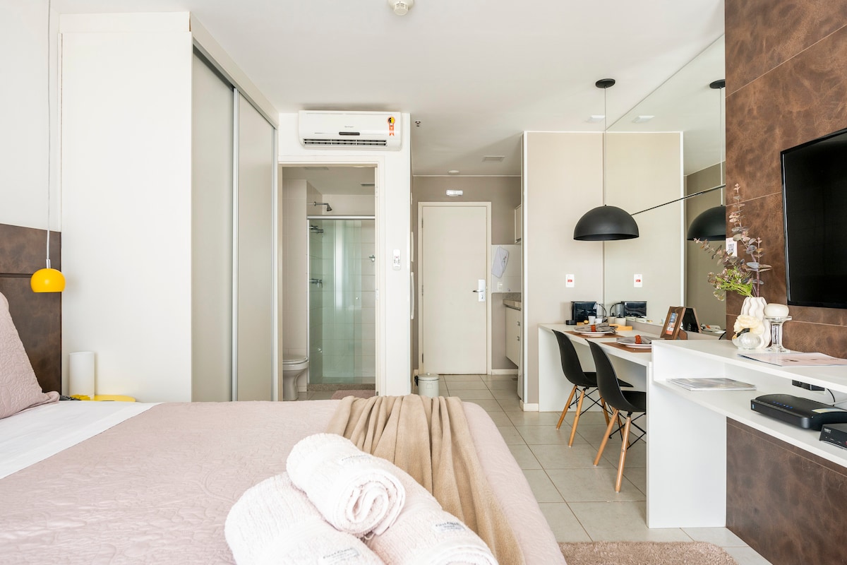 Уютная квартира в сердце Бразилиа! Откройте для себя комфортное и полноценное жилье, расположенное в нескольких шагах от эспланады министерств и основных достопримечательностей. В центре Бразилии, рядом с достопримечательностями и ресторанами. Что 🏠 включено: Полностью оборудованная кухня с микроволновой печью, холодильником, индукционной плитой и кофеваркой. ☕ Интернет 5G для быстрого подключения 💻 Умный телевизор и кондиционер для вашего комфорта. 📺❄️