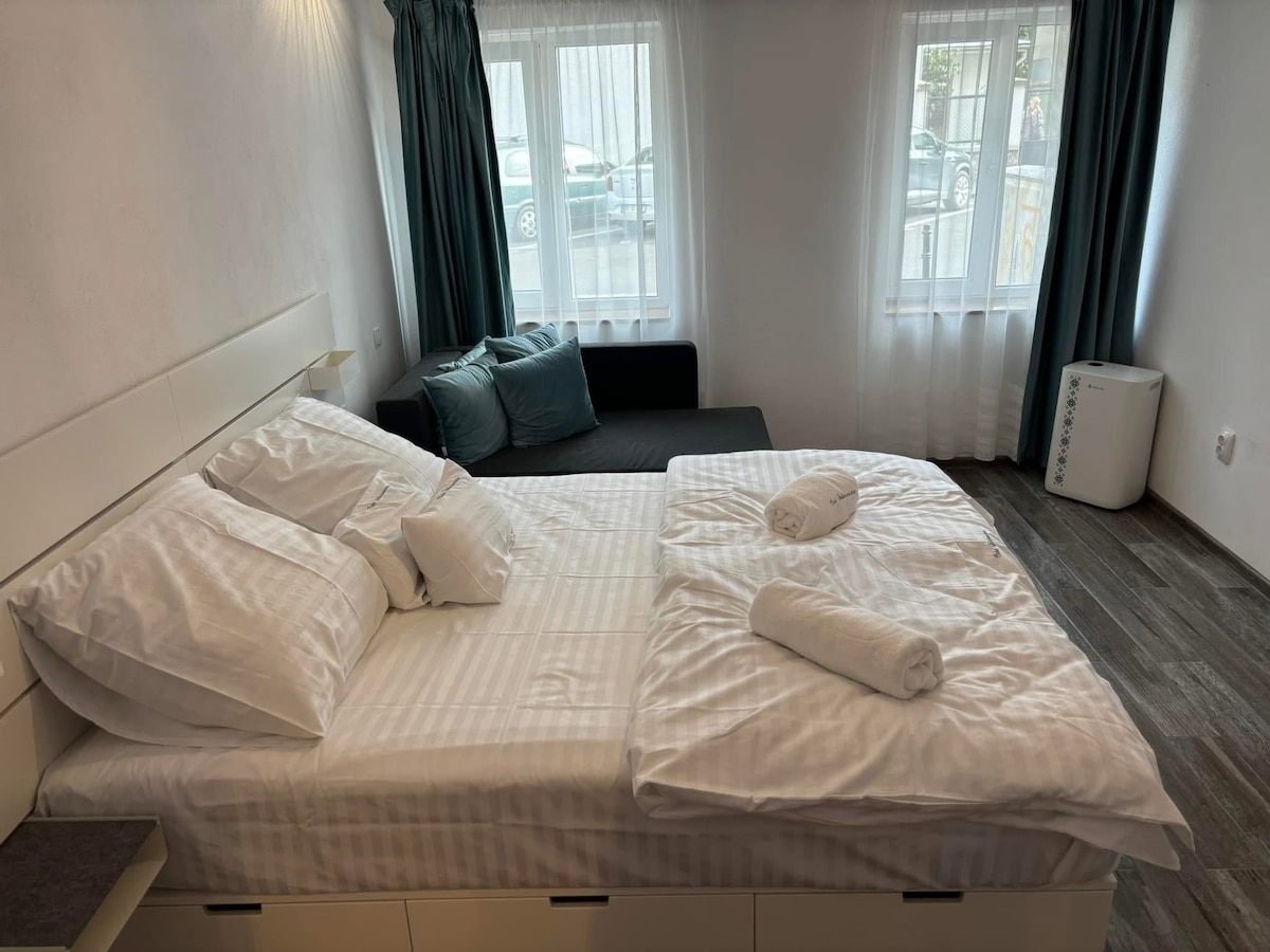 Camera oferă un spațiu elegant și primitor, perfect pentru cei care își doresc un plus de confort și o experiență relaxantă. Spatiul impresionează prin designul modern, atenția la detalii și dotările premium, incluzând un pat dublu confortabil (180x200 cm), baie privată complet echipată și facilități care îți asigură un sejur fără griji. Atmosfera caldă și balconul generos transformă fiecare moment într-o experiență de relaxare, perfectă pentru cupluri sau oaspeții care apreciază confortul.