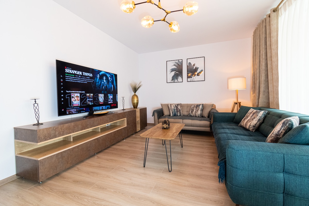 Pentha Apartment is a 2 bedroom, 2 bathroom apartment located in a brand new building, part of one of the newest neighbourhoods in Brasov, moments away from the largest shopping center in Transylvania, Coressi Shopping Centre. The apartment has 2 large bedrooms, each with a queen and king-size bed, a living room with direct access to a large balcony, and a fully equipped kitchen. Surrounding the apartment building are a kids' play area, restaurants, a pharmacy, and local shops. Welcome!