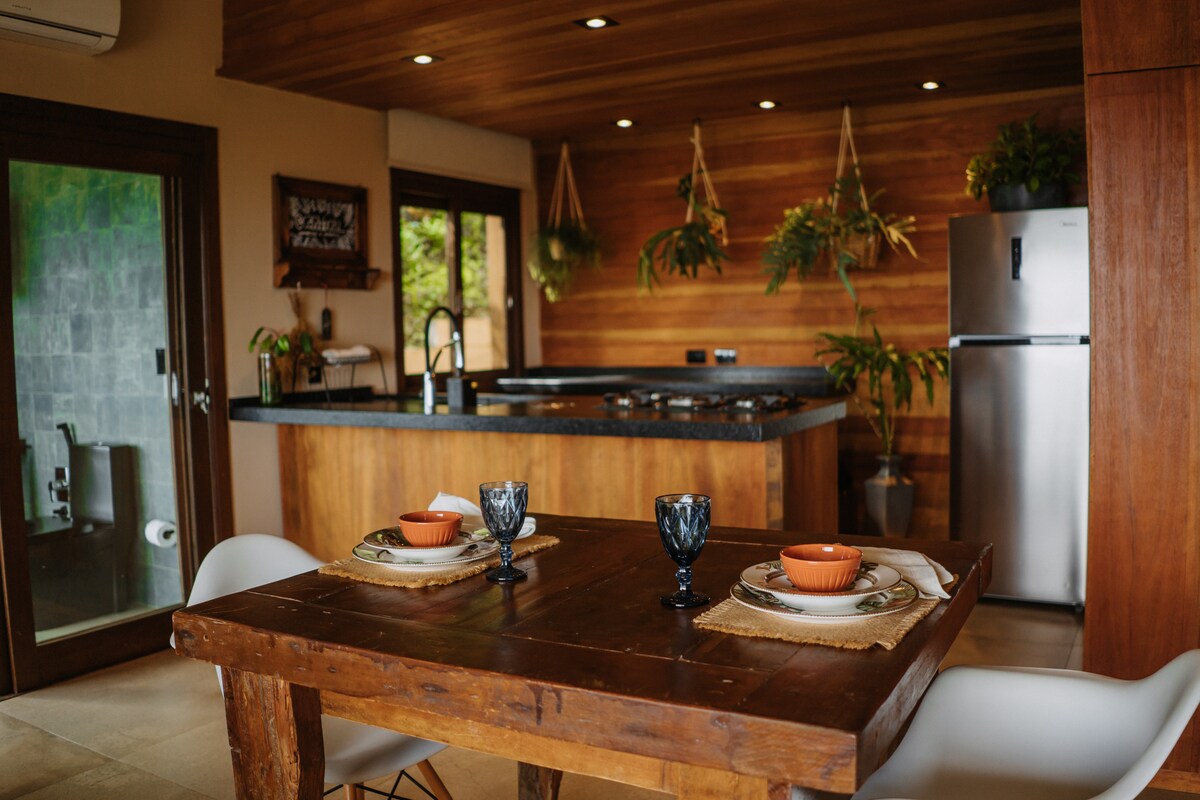 Очаровательные студии с самообслуживанием на прекрасном пляже Прумирим. Отдельный вход, частное патио, полностью оборудованная кухня, высококачественная кровать размера Queen size, удобная гостиная. Все спроектировано с качеством, комфортом и стилем. Большие панорамные окна позволят вам почувствовать, что вы среди вершин деревьев! Это волшебное место для тех, кто ищет романтический отдых у моря, соединяющее природу без ущерба для их комфорта. Все тщательно чистые, дезинфицированные и безопасные!