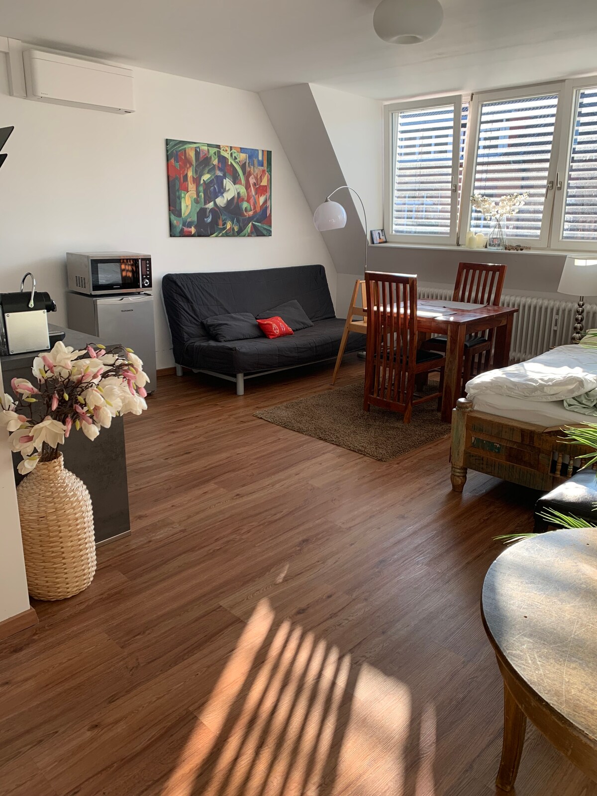 Добро пожаловать в мою квартиру! Квартира тихая и расположена примерно в 200 метрах от Dietenbachsee. До всех достопримечательностей легко добраться на трамвае. Остановка трамвая также находится примерно в 500 метрах от квартиры. На трамвае можно доехать от центрального вокзала до квартиры. Это квартира на чердаке и обилие света. Парковка может быть предоставлена по договоренности. Я живу прямо под квартирой и готов ответить на вопросы.