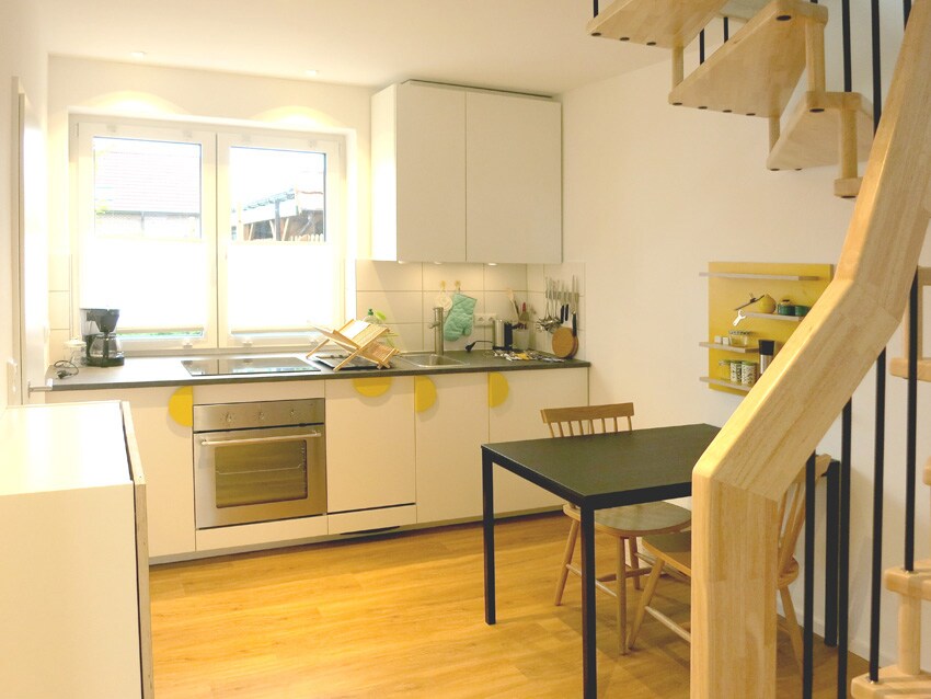 Современная квартира рядом с природой в стиле лофта. В мансардной квартире есть небольшой балкон с видом на сельскую местность . Хорошее подключение к Интернету через оптоволоконный кабель. Также имеется настенная коробка.